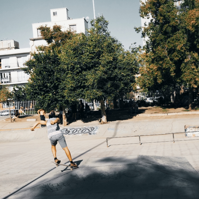 - "A skateboarder wearing a striped shirt and shorts rides a skateboard on a concrete skatepark with graffiti art" by FM-ZqBmD2, licensed under CC BY 4.0