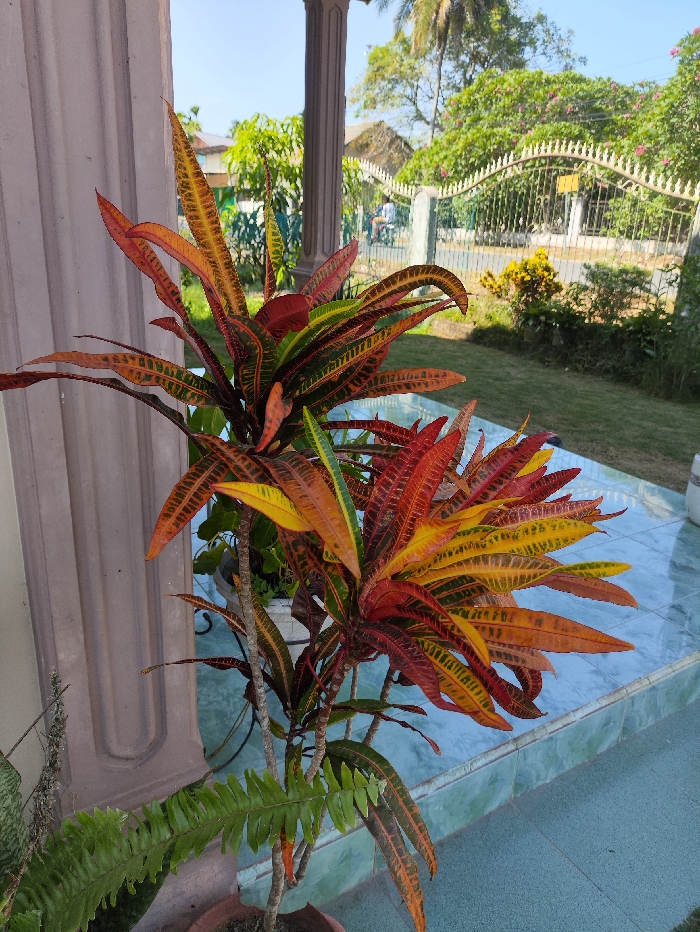The scene depicts an outdoor residential setting in Lhokseumawe, Indonesia, characterized by vibrant tropical foliage under a clear, bright sky. In the foreground, two large Croton plants (Codiaeum variegatum) with multi-stemmed growth are prominent, exhibiting striking leaves in shades of red, orange, yellow, and green. These plants are contained within visible terracotta pots, one partially obscured on the left, and stand on a tiled surface. The floor is composed of light blue or teal square tiles, extending to a single step on the right. A cream-colored architectural column with vertical fluting is visible on the far left, supporting an unseen structure. To the immediate right and partially obscured by the Croton plants, another smaller plant, possibly a fern, with green fronds is visible. In the midground, another cream-colored column matches the style of the foreground column. Beyond these architectural elements, a well-maintained lawn with various smaller green and yellow-leafed plants is visible. A decorative white metal fence with ornate scrollwork tops a short concrete wall, delineating the property line. Beyond the fence, a paved road or pathway is discernible. In the far background, partially obscured by trees and the fence, a lone individual wearing a light-colored shirt is visible, appearing to be seated or stationary. Large green trees, including a palm tree, and bushes with some flowering plants (pink and yellow) define the distant background. A small structure with a light-colored, possibly thatched roof, is visible through the foliage on the far left of the background. The environment suggests a sunny day.