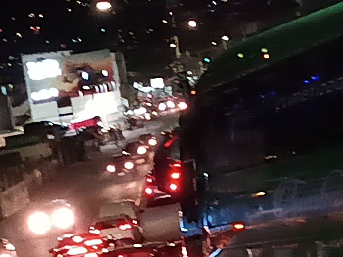 A night scene captures a busy street with traffic. Car headlights and taillights illuminate the road, indicating movement. A large building with illuminated signage dominates the left side. An overpass structure is visible to the right, with lights indicating its presence. The background features scattered lights, potentially from other buildings or streetlights. The image is slightly blurry, suggesting it may have been taken from a distance or with a moving camera.