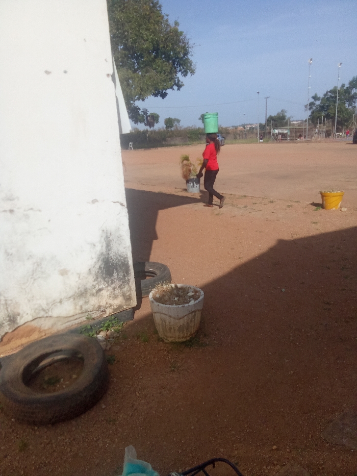 An outdoor scene features a woman in a red shirt carrying a green bucket on her head. She walks across a dirt ground with sparse vegetation and some objects. A building with a weathered wall occupies the left side of the image, near old tires and a potted plant. A yellow bucket sits to the right. In the background, there are scattered structures and trees beneath a bright sky.