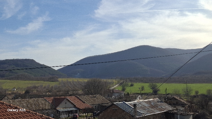 A panoramic outdoor view captures the landscape of Veliki Preslav, Bulgaria, under a clear blue sky with scattered white cirrus clouds and faint contrails. The horizon is dominated by a range of dark green to bluish-grey mountains, appearing forested and somewhat hazy. In the mid-ground, expansive agricultural fields display variations in color, from bright green cultivated patches to areas of light brown bare earth, interspersed with rows of dormant deciduous trees, likely orchards or vineyards. A narrow, light-colored road cuts diagonally through these fields from the middle-right towards the center-left. Utility lines, including a prominent dark horizontal wire, traverse the upper mid-ground. The foreground features a cluster of residential structures with varied roof types, predominantly reddish-brown tiles, some darker corrugated metal, and a few light-colored facades. The vantage point is from an elevated position, indicated by a partial view of a reddish-brown tiled roof in the lower left, which also bears a "Galaxy A55" watermark. No individuals, animals, or explicit actions are discernible. The scene is illuminated by daylight, suggesting clear weather.