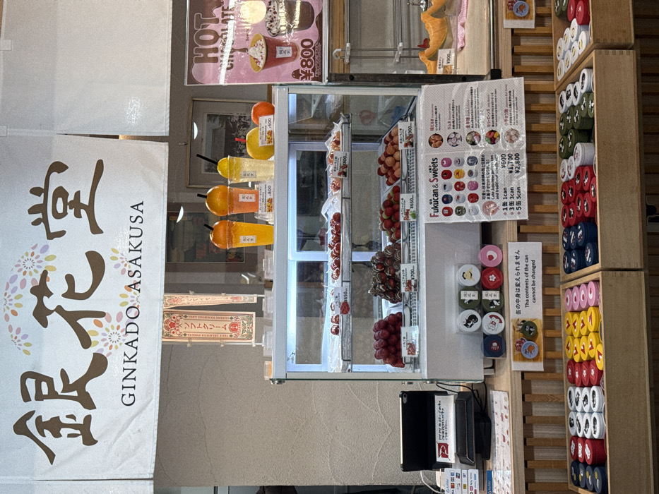The image depicts a retail confectionery display within a Ginkado Asakusa store, located in the Asakusa district of Taito, Japan