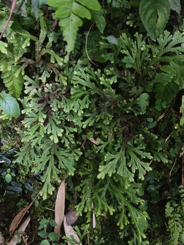 The image displays a close-up, top-down view of a dense, natural cluster of vegetation. The primary subjects are numerous small, intricate fern-like plants, possibly spike mosses, exhibiting finely divided fronds in varied shades of bright to dark green, with some central and basal areas showing darker, reddish-brown pigmentation. Interspersed among these are larger, broader green fern fronds visible at the edges of the frame, along with scattered small, three-lobed clover-like leaves. The underlying surface is covered by mosses and other small leafy plants, contributing to a lush, verdant environment. Several elongated, dried light-brown leaves lie partially visible at the bottom of the frame, integrated within the living flora. No human figures or artificial objects are present. The scene depicts an undisturbed natural micro-environment, located within the city of Tamghas, Nepal.