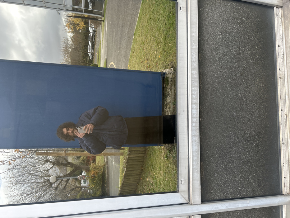 - "A male subject with dark, curly hair and a mustache, wearing a dark blue puffer jacket over dark clothing, is reflected in a large glass window" by FM-RlwBp1, licensed under CC BY 4.0