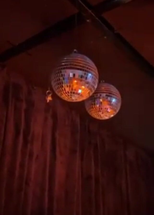 close-up view of two disco balls hanging from the ceiling in what appears to be a club or performance space. The disco balls are made of small mirrors and are reflecting orange and white light. To the left of the disco balls is a dark red, velvet curtain. The ceiling has black metal beams and is painted a dark color. At the bottom of the frame, parts of people's heads can be seen. The video has a dark and warm lighting.