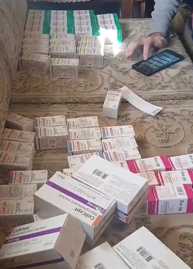 A person sits on a patterned sofa cushion among dozens of boxes of medications. The person is wearing a gray long-sleeved shirt and dark-colored pants. They are holding a smartphone in their right hand and appear to be looking at the screen. The sofa is covered with boxes of medications of various sizes and colors, including some that say "Cellcept" on the box. A paper prescription is visible among the boxes. Behind the sofa, there is a wooden cabinet or shelf with jars and other items on it. A yellow, smiley-face ball is near the edge of the sofa. The setting appears to be indoors in a home environment.
