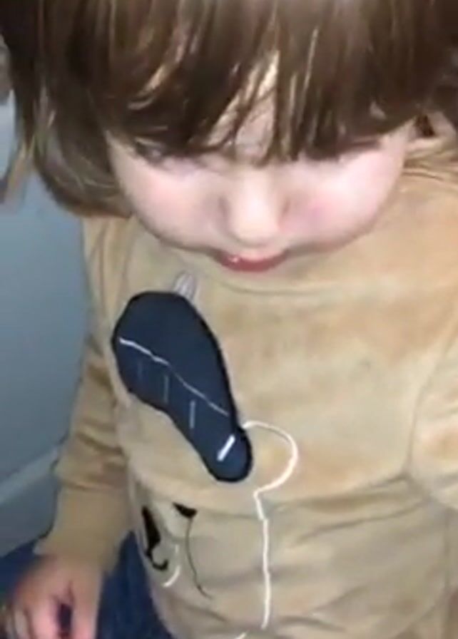 A young child is speaking to someone off camera. The child has light brown hair with bangs, and is wearing a tan colored, long sleeved shirt with a cartoon bear face on the front. The child is wearing blue jeans. The child’s eyes are occasionally red in the video. The child is looking down, and then looks up to the left and speaks. The child’s lips are red. The background appears to be a white wall. The camera is static.