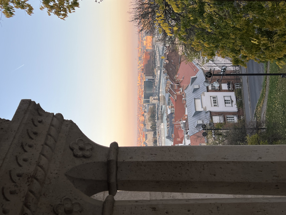 A panoramic view of Budapest, Hungary, is captured from a high vantage point, specifically from within an ornate stone architectural structure on the Buda side, likely Fisherman's Bastion, looking east towards the Pest side across the Danube River. The foreground on the left is dominated by a beige stone column and archway featuring carved floral and geometric motifs, framing the scene. The sky exhibits a clear gradient, transitioning from a light blue at the zenith to a warm orange-pink horizon, indicative of either sunrise or sunset. A single white contrail is visible in the upper left quadrant of the sky. Below the horizon, the cityscape of Budapest unfolds. The Danube River flows horizontally across the mid-ground, with a white, multi-deck passenger boat visible on its surface. The iconic Széchenyi Chain Bridge (Lánchíd) spans the river to the right of the boat, its suspension towers clearly discernible. Numerous buildings with varied architecture populate both banks, ranging from traditional structures with red-tiled roofs immediately below the viewpoint to modern, glass-fronted buildings further across the river. The distant cityscape on the Pest side shows a dense concentration of buildings with a warm, golden glow from the low sun. In the immediate mid-ground below the viewing platform, a series of houses with red-tiled and gray metal roofs line a winding asphalt road. A green, grassy slope with scattered autumn leaves and sparse trees borders the road, secured by a dark metal fence. Two tall, dark poles, each fitted with multiple disc-shaped elements resembling lights or sensors, stand beside the road. On the right side of the image, a portion of a tree with vibrant yellow-green autumn foliage is visible, partially obscuring the distant cityscape. No individuals are present or identifiable within the scene.