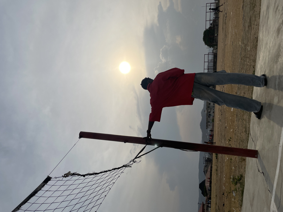A man wearing a red shirt and jeans stands next to a volleyball net, his hand resting on the pole. The sun shines brightly overhead, partially obscured by clouds. In the background, a field stretches out towards a distant landscape with hints of buildings and trees. The foreground shows a concrete surface with cracks, suggesting a sports court. A figure is seen in the background playing. The overall image appears to be taken at dawn or dusk with the subject in silhouette.