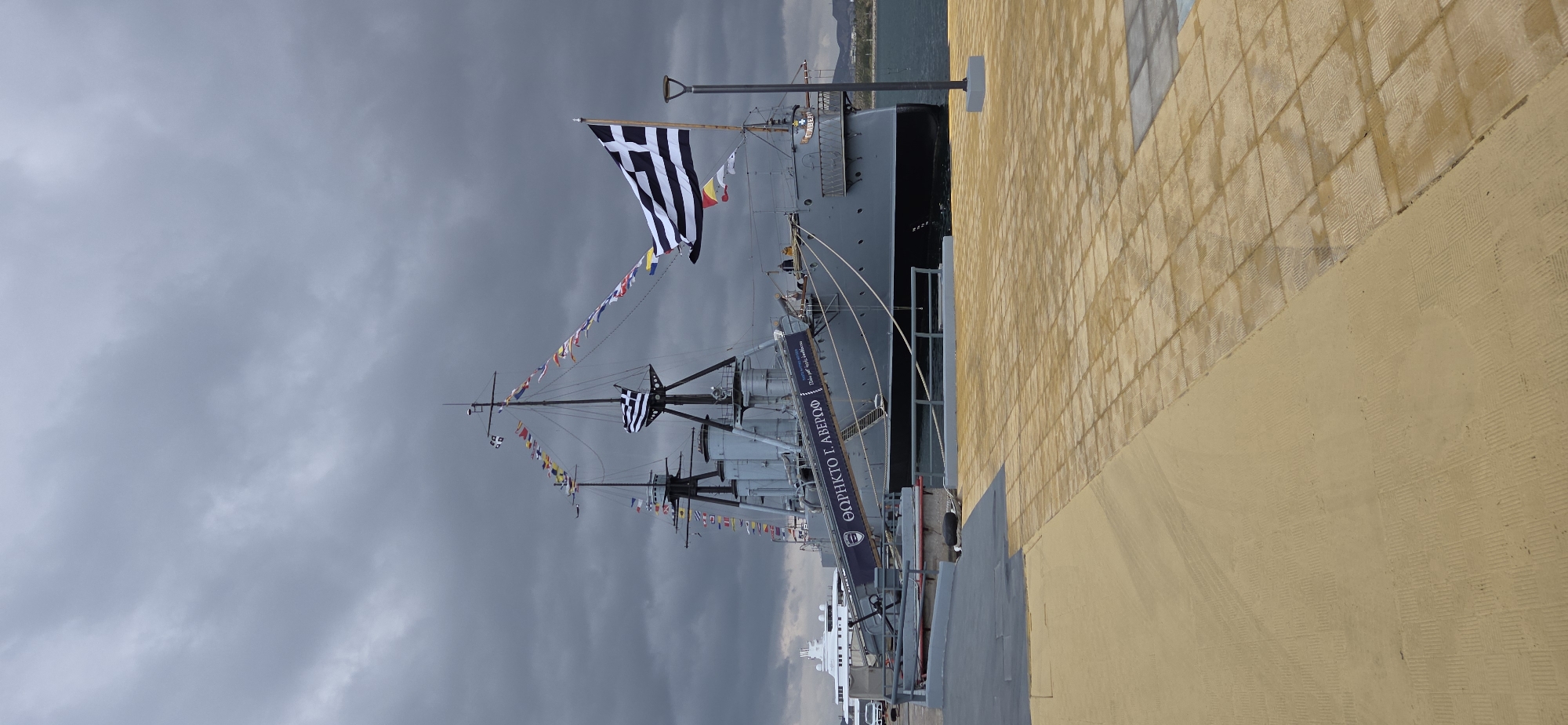 A large, grey naval vessel, identified as the Battleship G. Averof (ΘΩΡΗΚΤΟ Γ. ΑΒΕΡΩΦ) by text on its gangway banner, is prominently docked in a harbor in Palaio Faliro, Greece. The ship features a grey hull above a black waterline, with multiple masts, smokestacks, and a bridge superstructure. Strings of international maritime signal flags are draped between the masts, and a large Greek national flag (blue and white stripes with a cross) flies from a pole at the ship's stern, unfurled to the left. A smaller Greek flag is visible near the bow mast. A gangway, also bearing the ship's name, extends from the vessel to the pier. Indistinct human figures are visible on the ship's deck near the gangway and on the gangway itself. The foreground is a broad, flat pier constructed from yellow-orange tiles with a repetitive, textured grid pattern. A section of the pier closer to the ship is a darker grey. A tall, grey lamppost stands upright on the pier to the right of the ship's stern. The sky is heavily overcast with dark grey, thick clouds covering the entire upper portion of the frame. The water in the harbor, visible between the ship and the distant land, is calm and appears dark blue-grey. In the background to the left, a white superyacht or large pleasure craft is partially visible, docked further along the pier, with a white vehicle positioned on the dock nearby. Distant landmasses or hills are faintly visible on the horizon to the right, beyond the harbor water. No discernible specific human actions or interactions are clearly depicted.
