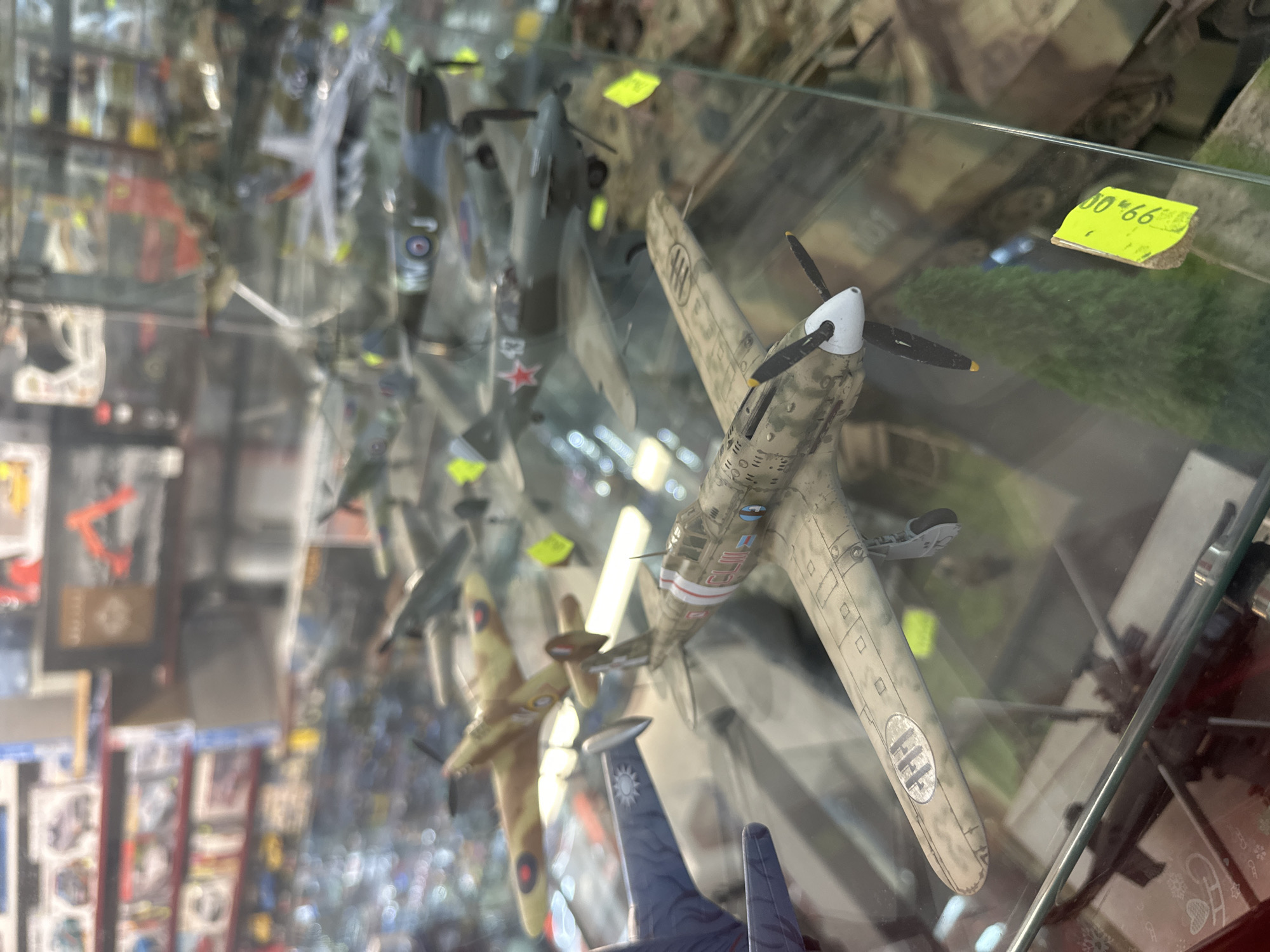 The image displays a collection of military aircraft scale models within a glass retail display case