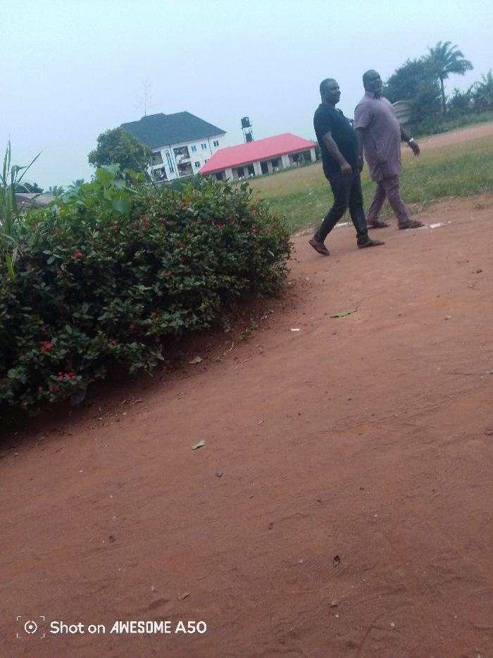 Two men walk along a red dirt path, past a flowering bush. One man wears a black shirt and dark pants, while the other wears a light purple outfit. In the background are two buildings, one white with a green roof and the other red. A palm tree is visible in the distance. The photo was taken with an Awesome A50.