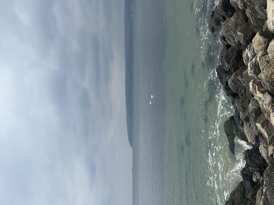 The image captures a coastal view from Varna, Bulgaria, overlooking the Black Sea on an overcast day. In the foreground, a breakwater or riprap composed of rough, angular dark grey and brown rocks forms the immediate shoreline, with small white-capped waves breaking against them. The water in the foreground is a clear, light greenish-blue, transitioning to a deeper blue-grey further out. Two white swans are visible floating together in the mid-distance on the water. The background features a prominent, heavily vegetated landmass, consistent with Cape Galata, extending into the sea from the right. Faint structural outlines are discernible along the distant coastline of this landmass. A large, dark vessel, possibly a cargo ship, is present on the far left horizon. The sky is uniformly covered with thick, grey clouds, indicating an overcast condition. No human figures are present.