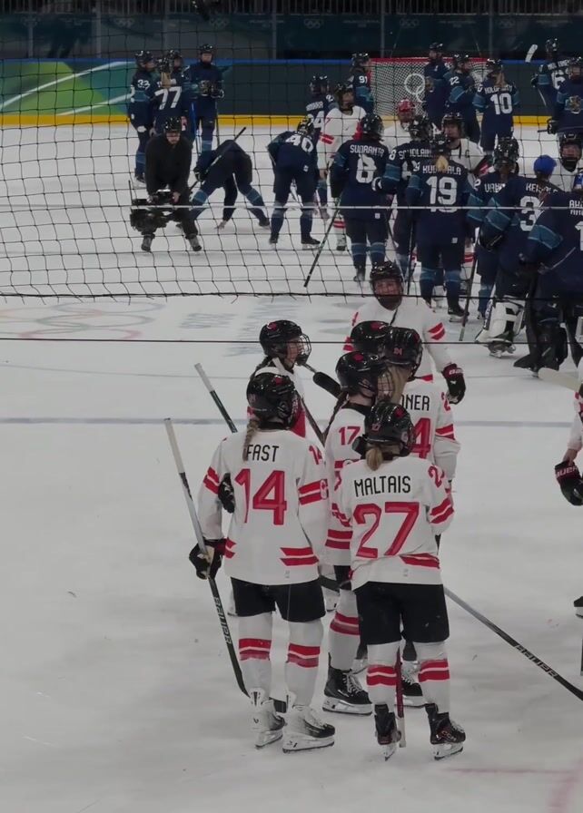 scene from an ice hockey game between Canada and Finland. Several players from both teams are visible, with the Canadian players wearing white jerseys with red accents and the Finnish players wearing blue jerseys. The players are gathered near the center of the ice rink after the game, likely congratulating or acknowledging each other. In the background, one can see the net, the Olympic rings, a person filming, and the crowd. The video also shows some of the team members, including Fast(14), Spooner(24), Maltais(27), Thompson(42), Shelton(17), and Suoranta(8).