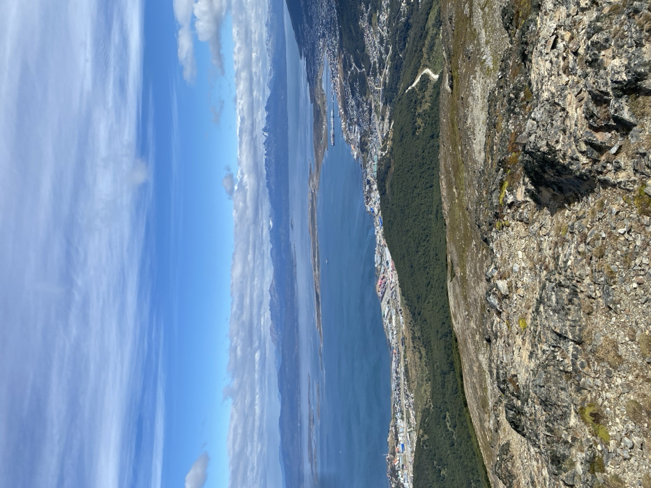 An aerial perspective shows a sprawling city along a waterfront, bordered by a dense forest on one side and the ocean on the other. In the distance, snow-capped mountains meet a cloudy sky. The foreground is dominated by rugged, rocky terrain. The landscape suggests a location with significant altitude and dramatic natural features.