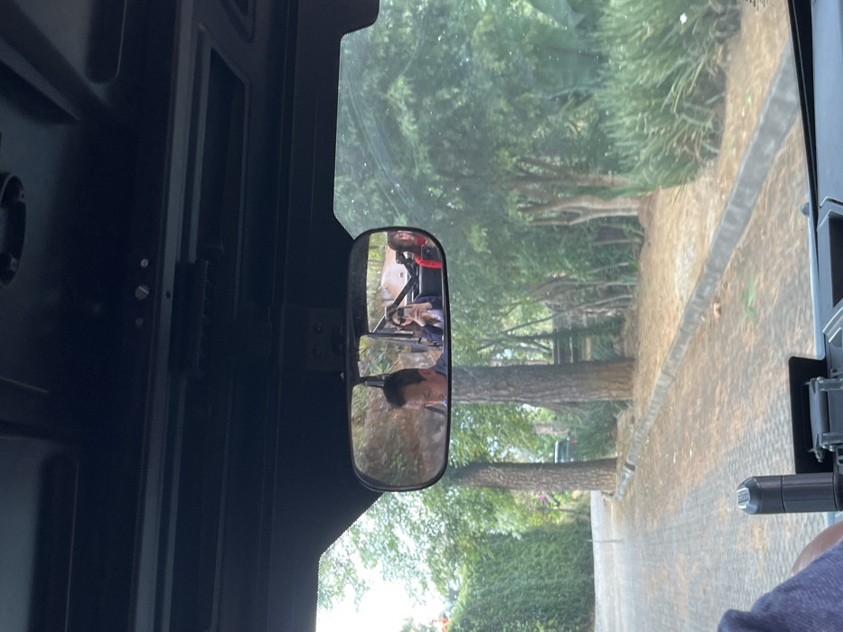 The view from inside a vehicle shows a lush, green landscape blurred by motion. A side mirror reflects two people. The mirror sits against a backdrop of trees and a narrow road, suggesting a leisurely drive through a wooded area. The vehicle's interior is predominantly dark, with visible panels and fixtures. The exterior scene dominates, offering a glimpse of a peaceful, natural setting.