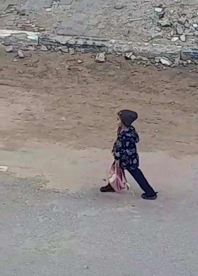 A young child wearing a dark patterned jacket, dark pants, a dark knit cap, and dark shoes walks on a gray asphalt surface. The child is carrying a pink bag in their left hand. The child walks from the right side of the frame towards the left. In the background is a raised area with a cobblestone texture and sandy or dirt ground. The video appears to be shot from an elevated position, possibly a window. A dark vertical element appears on the left side of the frame toward the end of the video, obscuring the view slightly.