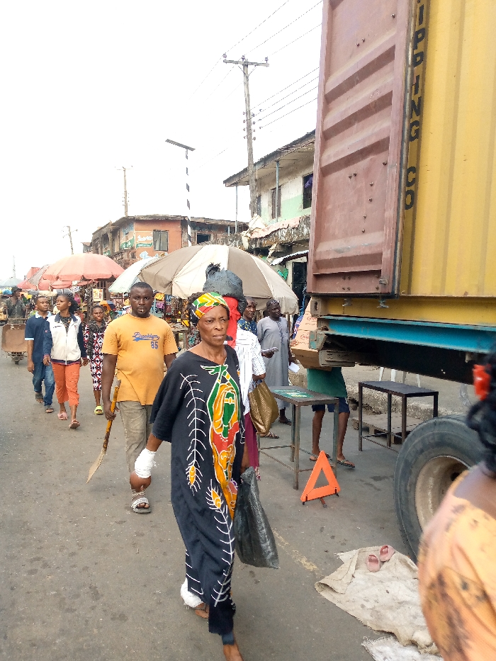 This image depicts a bustling street scene in Aba, Nigeria