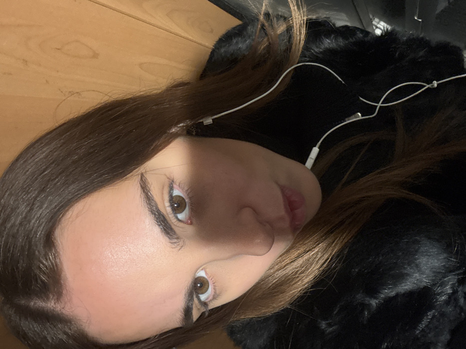 The image displays a close-up, high-angle portrait of a single individual, a female with long, straight, dark brown hair parted centrally. Her skin tone is fair, and she has brown eyes. She is wearing a black turtleneck garment under a black, possibly faux fur, coat. White wired earbuds are inserted into her left ear, with the cable extending downward across her chest. The individual's head is slightly tilted, and her expression appears neutral, with lips slightly parted. The background consists of light-colored wooden paneling or a wall, uniform in texture, suggesting an indoor environment. Lighting casts shadows across the subject's face, particularly on the left side of her nose and cheek, indicating a light source from the right and above. No discernible features within the image allow for the identification of a specific location within the city of Paris, France.