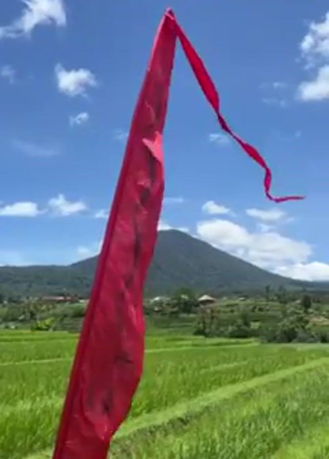 A low-angle shot reveals a bright, sunny day over a lush rice field, with a prominent red flag in the foreground. The flag, featuring dark lettering, is attached to a wooden pole and is blowing in the wind. The background showcases the rich greenery of the terraced rice fields, set against a backdrop of a large mountain. The sky is a clear blue with scattered white clouds.