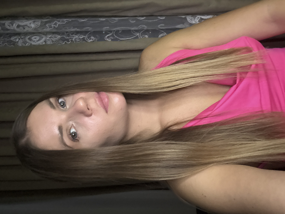 A woman with long, straight blonde hair lies against a dark, textured surface. She is wearing a bright pink top. Her face is partially obscured by her hair, but her eyes are visible and appear to be gray or green. Her expression is neutral. The background includes a textured or patterned fabric. The image is slightly rotated, giving a tilted perspective.