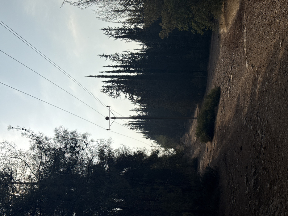 The image displays a forested area with an unpaved dirt road, likely situated within or on the periphery of Modi'in-Maccabim-Re'ut, Israel. The sky is a hazy, light grey-blue, with an obscured light source from the upper left casting long shadows across the ground. On the left side of the frame, a dense wall of dark coniferous trees, possibly pines, dominates the foreground, their upper branches silhouetted against the sky and showing numerous small, dark pine cones. In the central mid-ground, a dark brown wooden utility pole stands prominently, featuring a crossarm supporting insulators and at least two visible overhead power lines. These lines extend horizontally across the upper portion of the image and recede into the distance, connecting to a second, less distinct pole further along the path. To the right of the primary utility pole, a thick stand of tall, slender, dark coniferous trees, consistent with cypresses, rises vertically against the sky. The wide dirt road, composed of reddish-brown earth and scattered rocks, shows evidence of heavy use and appears to fork in the mid-distance, with one path continuing straight and another branching slightly to the right. Sparse green bushes are present on the road surface and along its edges. No individuals, animals, or vehicles are depicted.