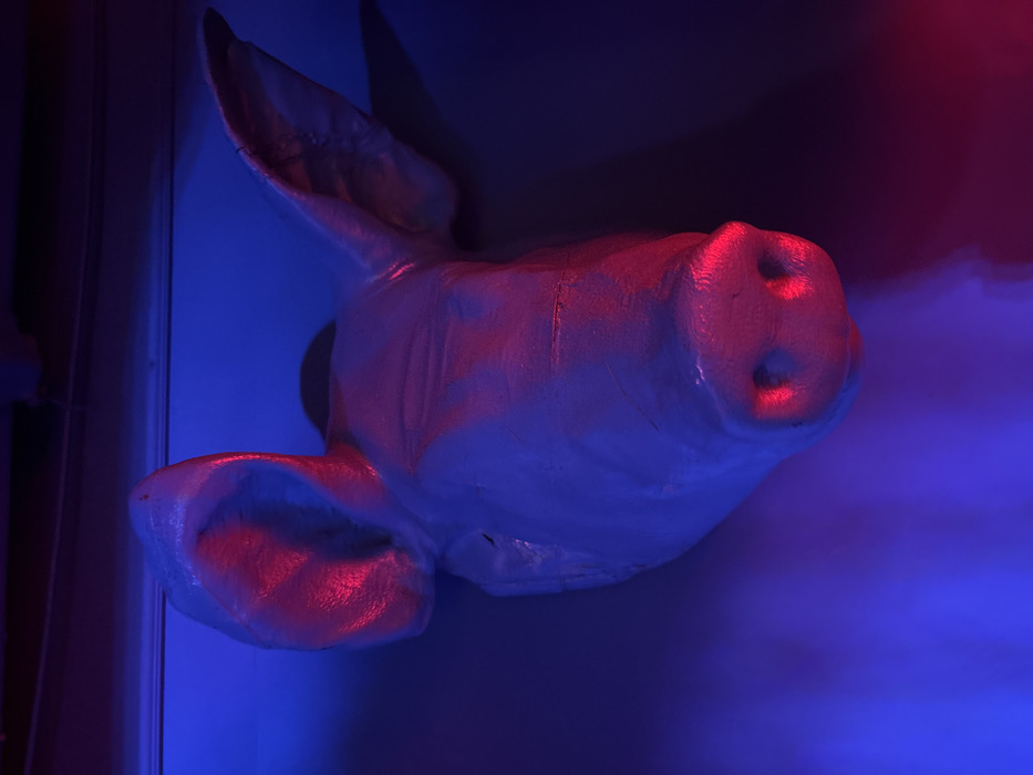 A white, wall-mounted replica of a pig's head is illuminated by contrasting neon lights