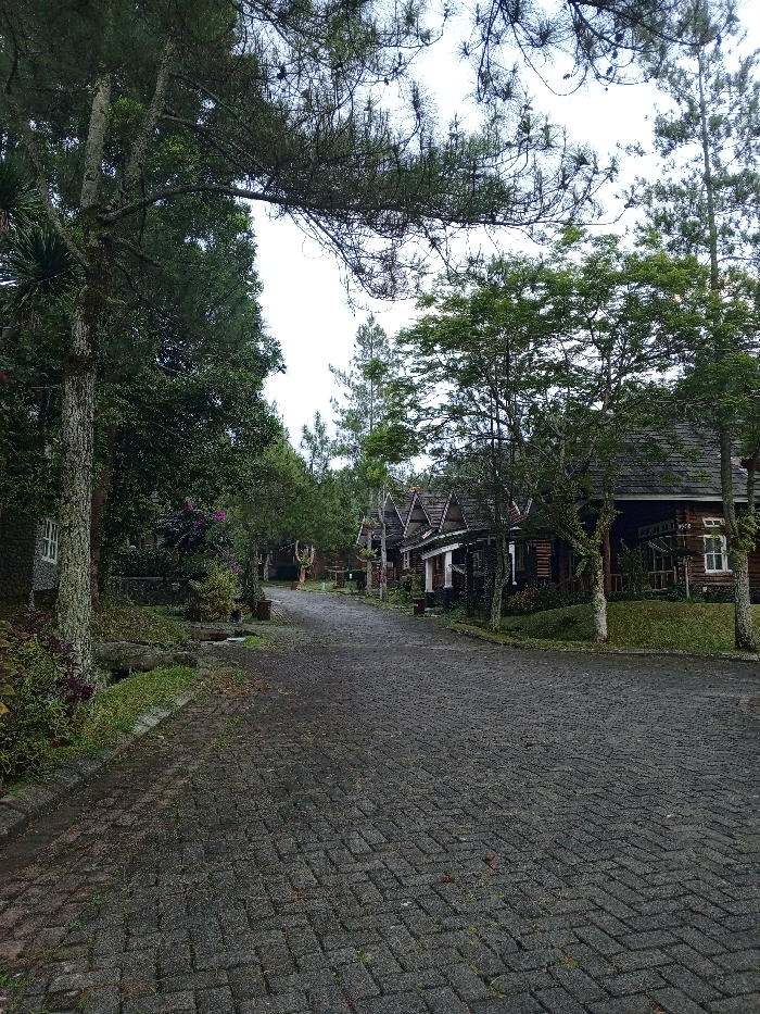 This image depicts a paved, herringbone-patterned cobblestone road curving slightly to the right, observed from a low angle. The scene is located in Weintiapa, Liberia. The road is bordered by dense vegetation on both sides, including various trees, shrubs, and ground cover. On the left, a tall, moss-covered tree trunk stands prominently near the foreground, partially obscuring a building with a white-framed window. Further down the left side, lush green and purple foliage is visible. To the right of the road, a row of multiple rustic, dark-stained log-style cabins or houses with dark shingled roofs and light-colored window frames are visible, receding into the distance. Each structure features a distinctive gable roofline. Several deciduous and coniferous trees with green leaves and needles are interspersed throughout the scene, some overhanging the road, contributing to a generally overcast and shaded environment. No individuals are present, and no discernible actions or interactions are occurring. The sky, visible through the tree canopy, appears bright but overcast, indicating diffuse lighting. The ground, including the cobblestone road, appears somewhat damp.