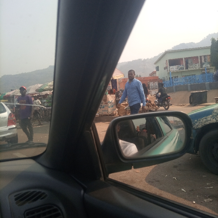 The image captures an outdoor street scene in the city of Dushepe, Nigeria, viewed from the front passenger side of a vehicle