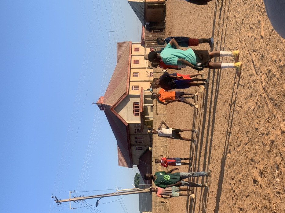 This image, captured in Barakin Akawo, Nigeria, depicts an open, reddish-brown dirt field under a clear blue sky. Approximately ten to twelve young Black males, appearing to be teenagers or pre-teens, are scattered across the foreground and midground, standing in various relaxed postures. Their shadows extend long to their right, indicative of low sun angle. Most individuals wear casual attire, including t-shirts and shorts, with some in jeans. One male in a green t-shirt with a white logo and blue jeans is positioned in the left foreground, walking towards the left. Another male, seen from behind in a light blue t-shirt and black shorts, occupies the right foreground. In the background, a prominent church building is visible, featuring a multi-gabled reddish-brown corrugated metal roof topped with a cross. Its light-colored walls contain multiple windows with red frames. A low, light-colored wall separates the dirt field from the church property. To the far left, a wooden utility pole with power lines and an attached street light stands diagonally. To the far right in the background, a smaller, single-story structure with a dark, sloped roof is partially visible. No active game or direct interaction is evident among the individuals, who appear to be gathered informally.
