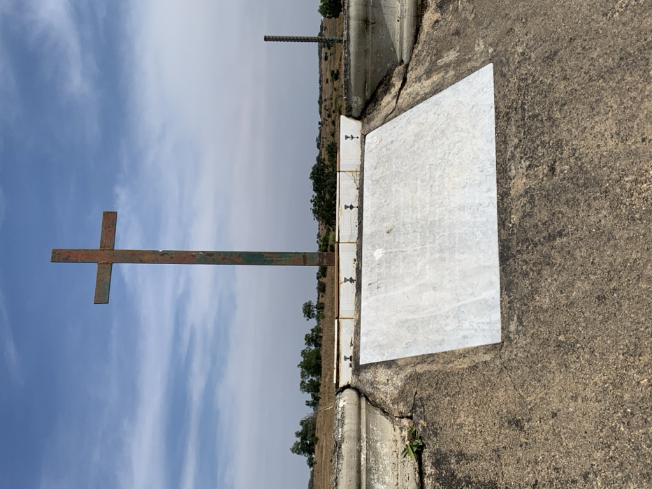 The image depicts an outdoor scene in DU, Nigeria, featuring a prominent Christian cross monument. In the immediate foreground, a weathered, dark gray concrete surface occupies the lower half of the frame. Embedded within this surface, angled upwards, is a rectangular white marble-like slab, possibly a memorial plaque, which appears blank or has illegible inscription from this distance. Cracks are visible in the concrete, particularly on the left side, where a small green plant sprouts. Above the foreground concrete, a lighter-colored, possibly tiled or stuccoed platform serves as a base for a large, upright metal cross. The cross is a dark orange-brown with visible green oxidation, indicating rust and weathering. To the right of the cross, a dark, vertical, ribbed cylindrical structure extends upwards from the platform. Along the front edge of this platform, several small, dark, bulbous objects are evenly spaced, resembling light fixtures or decorative finials. The background consists of a dry, open landscape under a clear to partly cloudy blue sky. Sparse, low-lying green trees and bushes are scattered across the tan and brown terrain, which appears undulating. No individuals, animals, or active events are present in the scene.