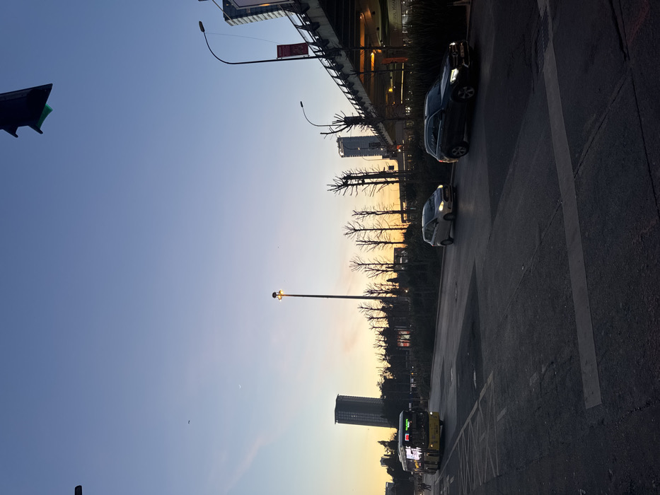 street scene at dusk. A clear, blue sky transitions to orange near the horizon. Silhouetted bare trees line the street. Cars are parked along the roadside. A bus with illuminated signs is also visible. Overhead, a modern building and a pedestrian walkway with street lights are present. A traffic light stands in the corner.
