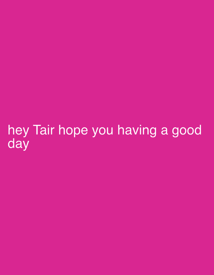 A magenta background displays white text. The text reads "hey Tair hope you having a good day". The text is located in the bottom left corner of the image. The composition is simple, with a vibrant background and a straightforward, friendly message.