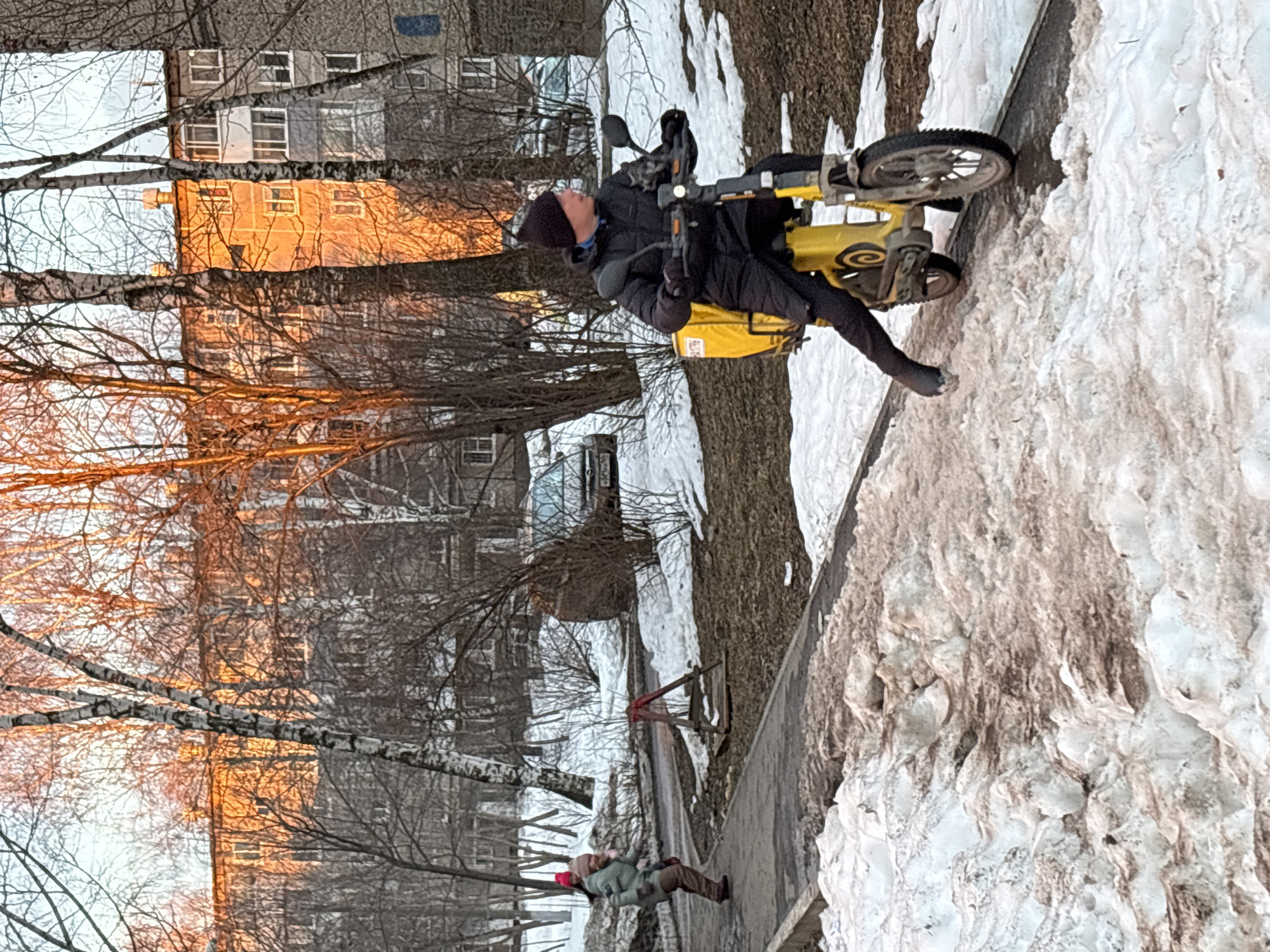 The image captures an urban scene in Perm, Russia, during what appears to be late winter or early spring, characterized by melting snow and bare deciduous trees. In the foreground, a male individual, dressed in a black puffer jacket, dark pants, dark gloves, and a black knit beanie, is operating a yellow electric scooter. A large yellow delivery bag is secured to the rear of the scooter. His right foot is extended towards the ground, and his head is turned to the left. To the left, a second person, wearing a light green jacket, brown pants, and a pink knit hat, is walking on a paved pathway. The ground is predominantly covered by patches of dirty, melting snow, exposing bare earth and some dry vegetation. An orange A-frame structure is visible on the ground near the pathway. In the background, through the leafless trees, multiple multi-story apartment buildings are visible. One building facade is illuminated by a low-angled sun, casting a warm orange glow, while others appear grey. A light-colored car is partially visible parked in the background on the right.