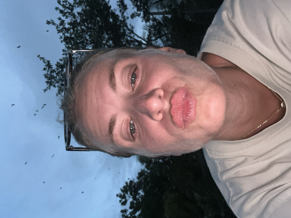 The image captures a close-up, front-facing view of a person, likely female, situated outdoors in Thissamaharama, Sri Lanka, during twilight. The individual has light-colored hair, pulled back, with eyeglasses resting on top of their head. They are wearing a light-colored t-shirt and a thin gold-colored necklace with a small circular pendant. The subject's lips are pursed in a 'kiss' or 'pout' expression, and their eyes are open, looking directly forward. The background consists of a blue-grey sky typical of dusk, against which dark silhouettes of trees are visible. Numerous small, dark forms, consistent with flying bats, are scattered across the sky, particularly in the upper left portion, indicating the evening emergence of fruit bats, a common phenomenon in the Thissamaharama area.