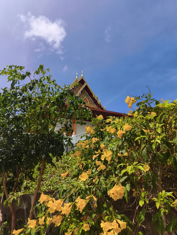 A Thai temple's ornate, multi-tiered roof with golden finials peeks above lush greenery. Vibrant yellow trumpet flowers cascade from the right, contrasting with the darker green foliage on the left. A patch of blue sky, dotted with a single white cloud, forms the backdrop. The temple's white walls are partially visible, nestled amidst the flora.