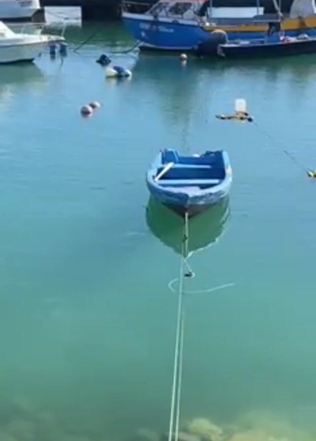 marina. A small, blue rowboat is tied to the rocky edge of the harbor. The water is calm and clear with a slight green tint. The rowboat is centered in the frame. In the background, several larger boats are docked along a gray concrete pier. Some people are visible on one of the boats, but their actions are indistinct. The sky is bright with sunlight.