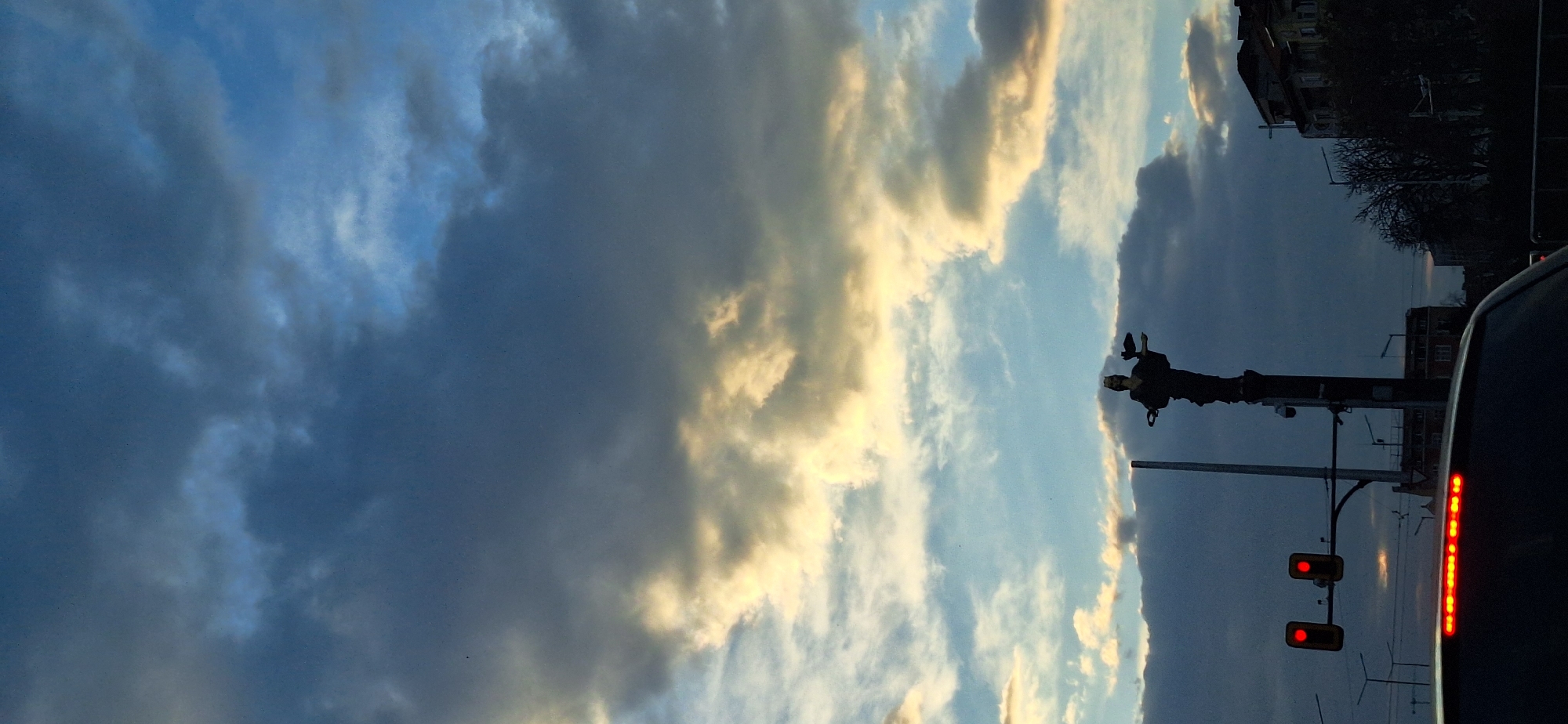 The image depicts a static street scene in Sofia, Bulgaria, centered on the Statue of Saint Sophia located in Serdika Square. The statue, a dark silhouette of a crowned female figure holding a wreath and an owl, stands atop a tall column against a cloudy sky. The sky features dark blue-grey clouds with patches of bright blue and some clouds illuminated with yellowish-orange light, suggesting a late afternoon or early evening setting. In the lower left quadrant, a traffic light pole displays two illuminated red lights. To the left and slightly behind the statue, another tall, dark pole is visible. The foreground shows the dark-colored rear section of a vehicle, with its red LED third brake light illuminated across the top. On the right side of the image, silhouetted building structures and bare trees are visible against the skyline, indicating an urban environment. No individuals are discernible in the scene.