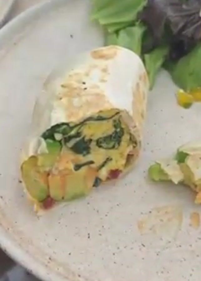 plate with a partially eaten breakfast burrito, cut in two, and a side salad. The burrito contains egg, spinach, avocado, and chopped tomatoes. The plate is light gray with darker speckles. A fork rests near the cut burrito piece. A cup of coffee is also visible in the background.