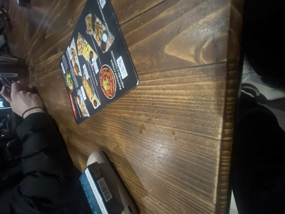 - "The scene depicts an interior view of a cafe or restaurant in Asenovgrad, Bulgaria, focusing on a dark brown wooden plank table" by FM-h7vTq2, licensed under CC BY 4.0