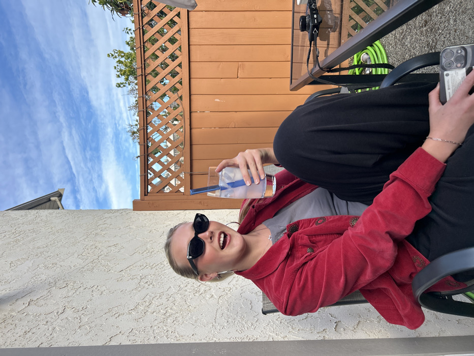 A young female is seated outdoors in a residential backyard or patio setting, situated in Victoria, Canada. She is positioned facing slightly right of the camera, wearing black cat-eye sunglasses, large silver hoop earrings, a red corduroy jacket over a grey t-shirt, and black wide-leg pants. Her blonde hair is pulled back, and she is smiling broadly with her mouth open. Her left hand holds a clear glass containing a light purple liquid, ice cubes, and a blue reusable straw. Her right hand rests on her lap, holding a grey smartphone. To her right, a black compact camera with a lens is visible on a dark-framed glass-top patio table. The background features a light-colored stucco building wall on the left, a tall brown wooden fence with a lattice top section, and green foliage visible above the fence line. A white rain gutter runs along the top of the stucco wall. A green coiled garden hose is partially visible on the ground behind the table. The sky above is blue with scattered white clouds.