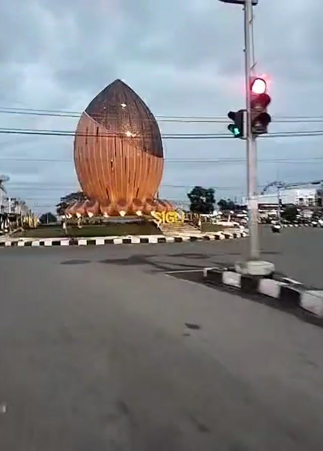 large monument in the center of a traffic roundabout. The monument is shaped like a bulbous object, possibly a seed pod, and is lit up. The word "SIGLI" is written in large, illuminated letters around the base of the monument. There is a traffic light visible, currently showing a red light. The video appears to be taken from a moving vehicle, likely a motorcycle or scooter. The sky is overcast.