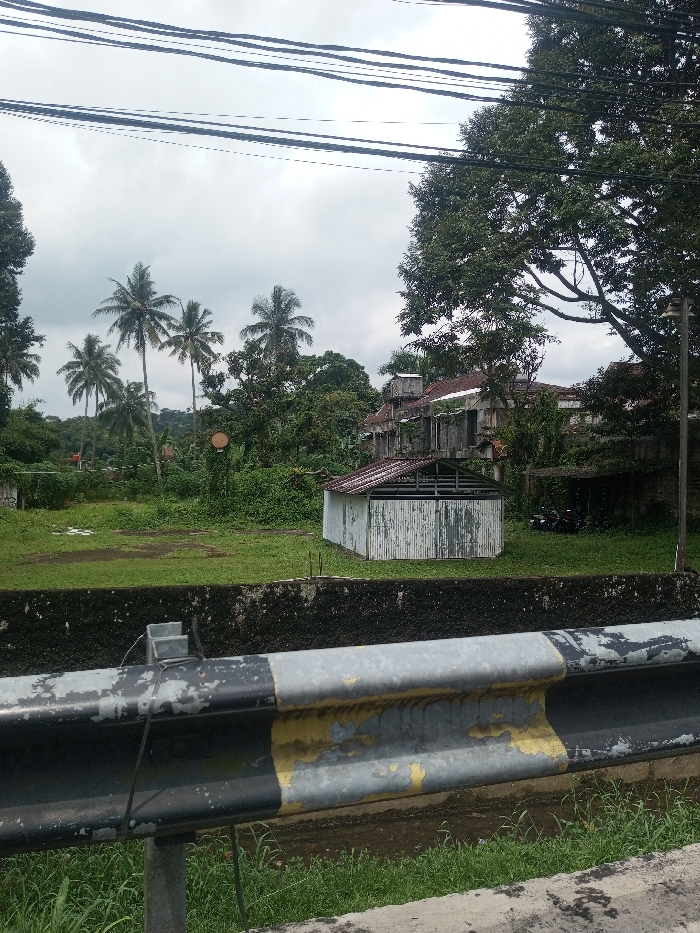This image captures an outdoor scene in Chori, Nigeria, under an overcast sky. In the foreground, a weathered metal guardrail, painted gray and black with significant peeling yellow and black paint, runs horizontally. Below the guardrail, a concrete wall exhibits dark discoloration and moss, with green grass visible at its base. The midground features an expansive, unkempt grassy field. A small, rectangular, single-story structure with corrugated metal siding and an exposed roof frame stands on the right side of this field. To its right, a larger, multi-story building with a reddish-brown tiled roof appears structurally compromised or incomplete, partially obscured by dense green foliage. Two dark-colored motorcycles are parked near this larger building. A utility pole with a circular, dish-like object is visible in the left-midground, amidst overgrown vegetation. Another tall light pole stands on the far right. The background is characterized by numerous tall palm trees and dense, dark green tropical foliage extending across the horizon. A distant, green-covered hillside is visible on the left. The sky is uniformly gray with heavy cloud cover. Multiple dark overhead power lines traverse the upper portion of the frame. No individuals, animals, or active subjects are present.