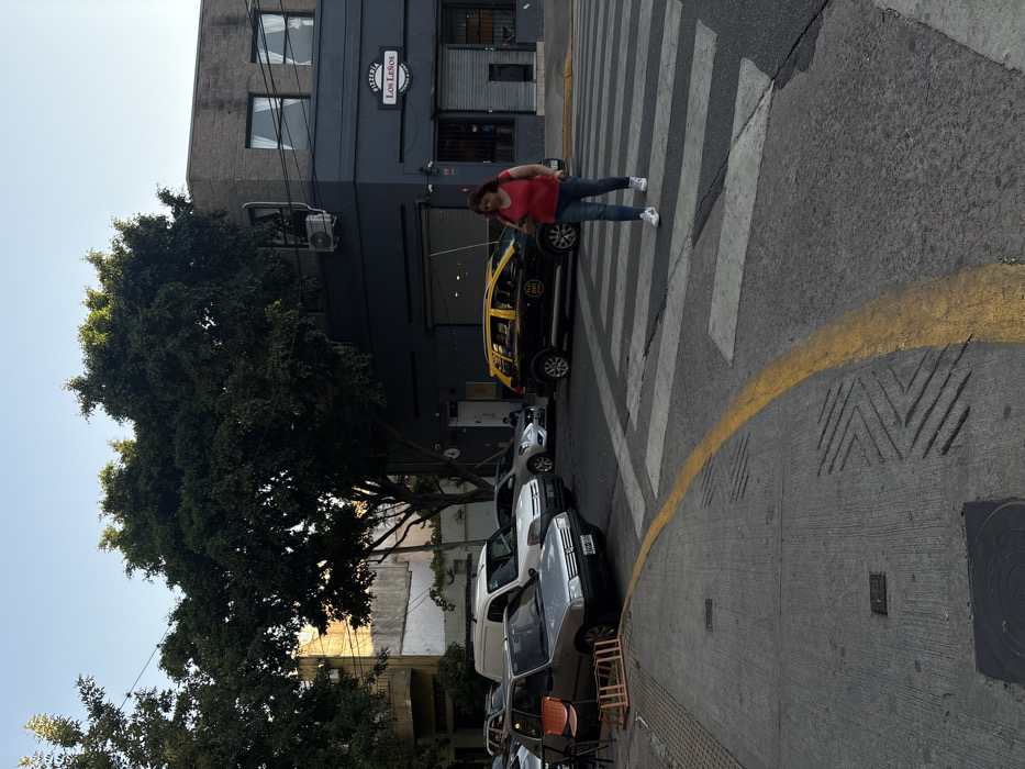 A street scene shows a woman in a red shirt and jeans crossing a zebra stripe crosswalk. A yellow taxi is parked alongside the crosswalk, and other vehicles are parked further down the street. A large, full tree stands beside the building in the background. The street is gray and the sky is pale blue.