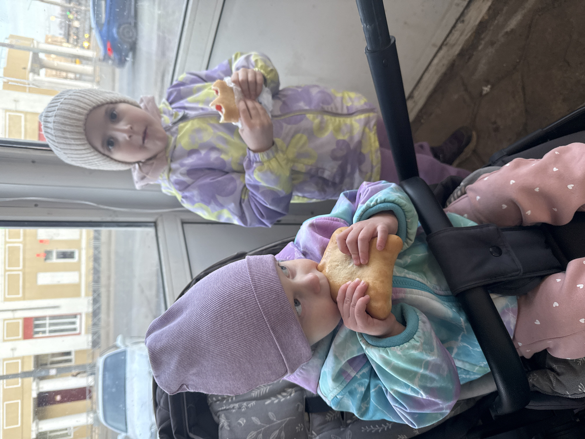 Two young children are depicted. One child, wearing a white knit hat and a light purple jacket with yellow flower patterns, is sitting near a window, holding and eating a pastry. The second child is in a stroller, wearing a lilac knit hat and a tie-dye jacket, also holding and eating a pastry. The stroller is black and the child is also wearing pink clothing with small white hearts. The background shows a cityscape with buildings, potentially viewed through a window. The location is Bol'shie Mkhi, Russia. A black stroller handle is visible in the foreground.