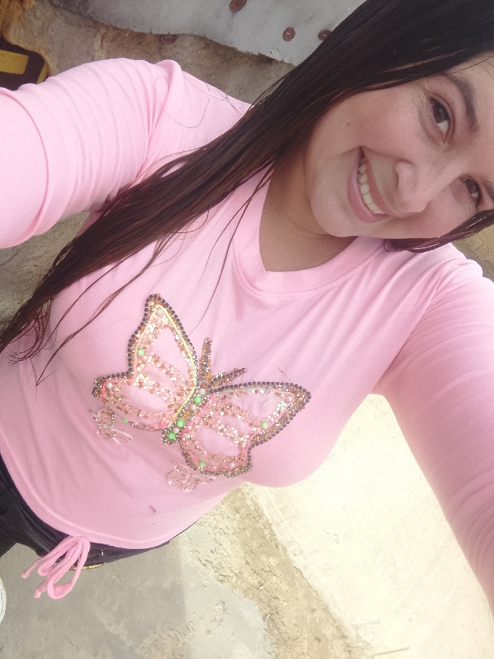 A smiling woman with long, dark hair poses for a selfie. She is wearing a pink long-sleeved shirt adorned with a sparkling butterfly appliqué. The butterfly features pink and gold sequins, beads, and light green accents. A black garment with a pink drawstring is visible on the left side. The background shows a concrete surface and a wall.