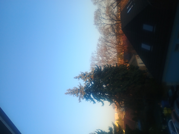 The image displays an elevated view of a residential area in Levice, Slovakia, under a clear, light blue sky. A dark horizontal structure, consistent with an architectural element or window frame, is present at the very top edge. In the midground, two prominent, dark green evergreen trees stand to the left, partially obscuring a lighter-colored building with a dark roof. To the right of these evergreens, a line of deciduous trees with bare branches is visible, illuminated by a warm, low-angle light that casts an orange-red glow on their upper portions. The foreground on the right features a dark, sloping roof with two rectangular skylights. Below the evergreen trees and to the bottom left, the top portions of several parked vehicles, including a silver station wagon and two darker cars, are visible on a shadowed ground surface. Faint outlines of taller, lighter-colored buildings are discernible on the distant horizon to the left. No individuals or specific actions are depicted. The lighting suggests either sunrise or sunset.