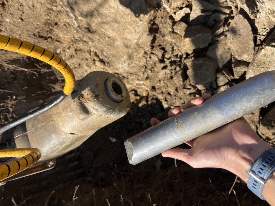 The scene depicts a close-up, ground-level view of an excavation area in Dolni Pasarel, Bulgaria, under bright daylight conditions. In the foreground, a light-skinned human hand, wearing a blue textured wristband with a silver buckle, holds a long, cylindrical, metallic tool bit. The tool bit, approximately 40-50 cm in visible length, is silver-gray, exhibits wear and dirt, and has a flat, angled, or broken tip. In the background, partially obscured by the hand and tool, is the dirty, robust body of a hydraulic breaker attachment, likely mounted on heavy machinery, positioned within a trench of disturbed soil and rocks. The breaker's tip housing, a circular opening designed to accept a tool bit, is visible. Two yellow, spiral-wrapped hydraulic hoses are connected to the breaker, one extending upwards and another to the right, along with a segment of a black hose. The surrounding ground consists of loose brown soil mixed with various sizes of crushed rock and pebbles. The hand is positioned as if presenting or examining the tool bit in relation to the breaker.