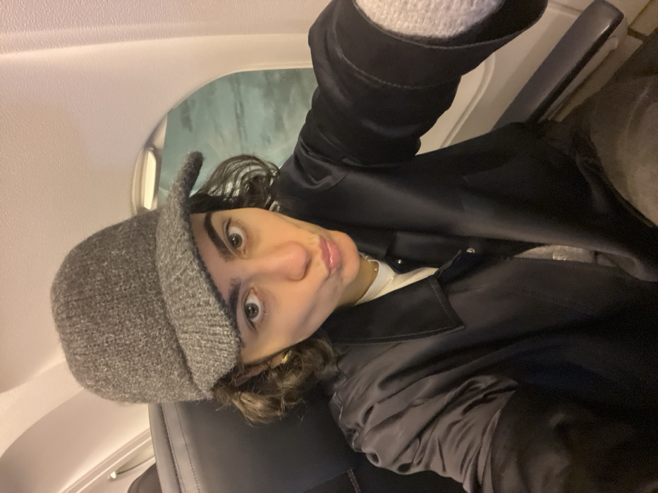 A person wearing a gray newsboy cap and a black jacket takes a selfie on an airplane