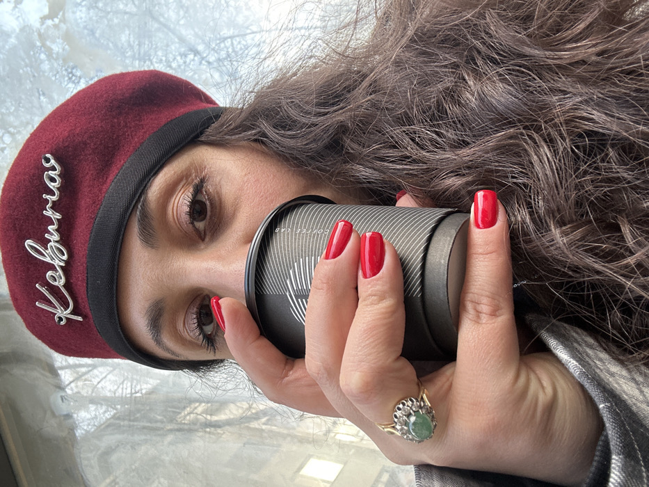 A close-up, slightly high-angle shot depicts a person, likely female, from the chest up, holding a black disposable coffee cup to their mouth. The individual has dark, wavy hair and wears a deep red felt beret with a black band. Affixed to the beret is a silver-colored script-style pin spelling "Keburia." The visible fingernails of the left hand are painted with bright red nail polish, and a prominent ring with an oval green gemstone set in gold-toned floral metalwork is worn on the ring finger. The coffee cup features a textured pattern of fine grey lines, a white radial logo, and the vertical inscription "COFFEE LAB." The background is out of focus, showing bare tree branches and faint architectural elements, indicative of an outdoor or window-adjacent urban setting in Tbilisi, Georgia, based on the identified "Keburia" branding and the "Coffee Lab" cup.